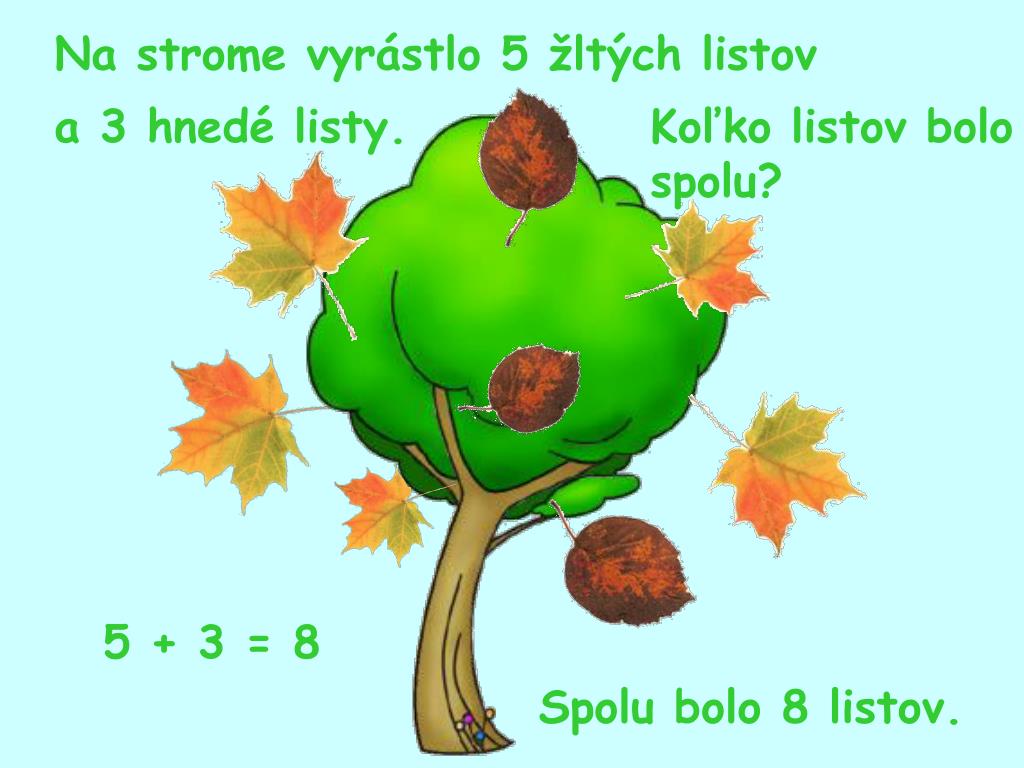 Na strome vyrástlo 5 žltých listov a 3 hnedé listy. Koľko listov bolo spolu? 5 + 3 = 8 Spolu bolo 8 listov.
