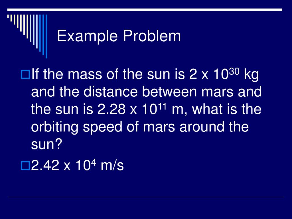 Example Problem • If the mass of the sun is 2 x 1030 kg and the distance between mars and the sun is 2.28 x 1011 m, what is the orbiting speed of mars around the sun? • 2.42 x 104 m/s