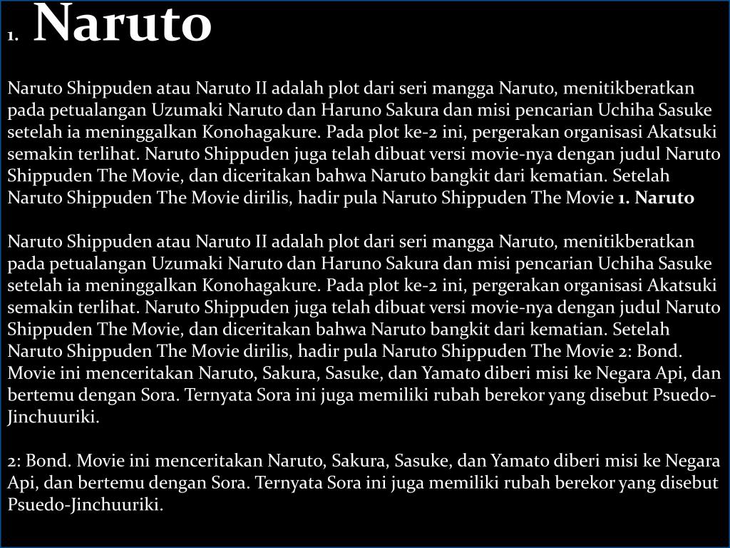1. Naruto Naruto Shippuden atau Naruto II adalah plot dari seri mangga Naruto, menitikberatkan pada petualangan Uzumaki Naruto dan Haruno Sakura dan misi pencarian Uchiha Sasuke setelah ia meninggalkan Konohagakure. Pada plot ke-2 ini, pergerakan organisasi Akatsuki semakin terlihat. Naruto Shippuden juga telah dibuat versi movie-nya dengan judul Naruto Shippuden The Movie, dan diceritakan bahwa Naruto bangkit dari kematian. Setelah Naruto Shippuden The Movie dirilis, hadir pula Naruto Shippuden The Movie 1. Naruto Naruto Shippuden atau Naruto II adalah plot dari seri mangga Naruto, menitikberatkan pada petualangan Uzumaki Naruto dan Haruno Sakura dan misi pencarian Uchiha Sasuke setelah ia meninggalkan Konohagakure. Pada plot ke-2 ini, pergerakan organisasi Akatsuki semakin terlihat. Naruto Shippuden juga telah dibuat versi movie-nya dengan judul Naruto Shippuden The Movie, dan diceritakan bahwa Naruto bangkit dari kematian. Setelah Naruto Shippuden The Movie dirilis, hadir pula Naruto Shippuden The Movie 2: Bond. Movie ini menceritakan Naruto, Sakura, Sasuke, dan Yamato diberi misi ke Negara Api, dan bertemu dengan Sora. Ternyata Sora ini juga memiliki rubah berekor yang disebut Psuedo-Jinchuuriki. 2: Bond. Movie ini menceritakan Naruto, Sakura, Sasuke, dan Yamato diberi misi ke Negara Api, dan bertemu dengan Sora. Ternyata Sora ini juga memiliki rubah berekor yang disebut Psuedo-Jinchuuriki.