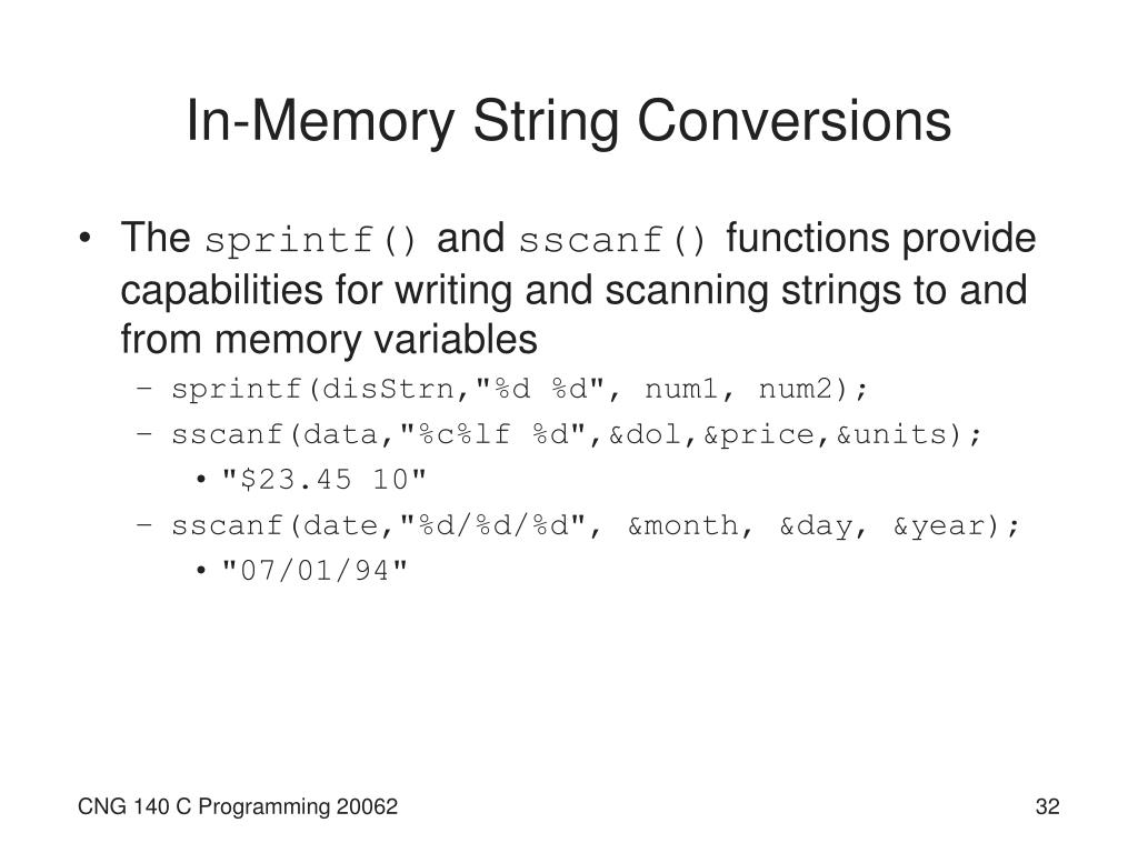 In-Memory String Conversions • The sprintf() and sscanf() functions provide capabilities for writing and scanning strings to and from memory variables • sprintf(disStrn,"%d %d", num1, num2); • sscanf(data,"%c%lf %d",&dol,&price,&units); • "$23.45 10" • sscanf(date,"%d/%d/%d", &month, &day, &year); • "07/01/94" CNG 140 C Programming 20062