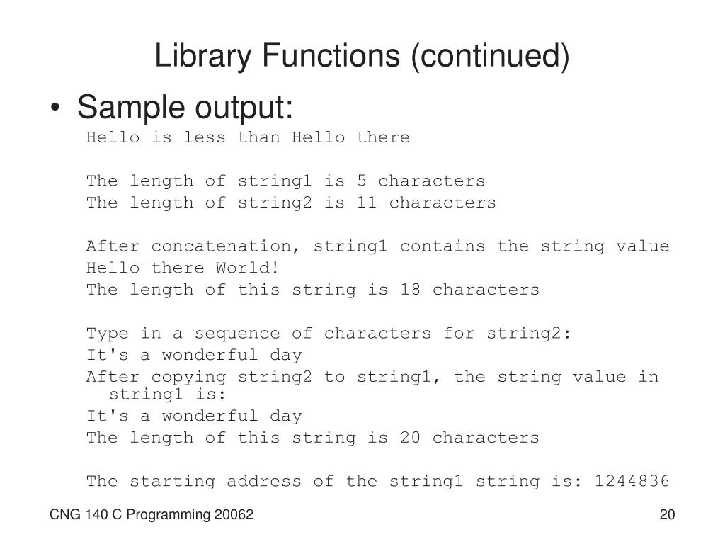 Library Functions (continued) • Sample output: Hello is less than Hello there The length of string1 is 5 characters The length of string2 is 11 characters After concatenation, string1 contains the string value Hello there World! The length of this string is 18 characters Type in a sequence of characters for string2: It's a wonderful day After copying string2 to string1, the string value in string1 is: It's a wonderful day The length of this string is 20 characters The starting address of the string1 string is: 1244836 CNG 140 C Programming 20062