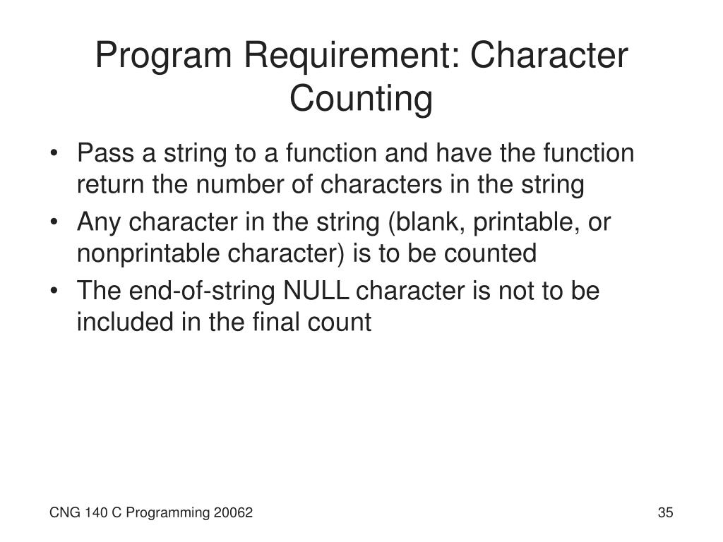 Program Requirement: Character Counting • Pass a string to a function and have the function return the number of characters in the string • Any character in the string (blank, printable, or nonprintable character) is to be counted • The end-of-string NULL character is not to be included in the final count CNG 140 C Programming 20062