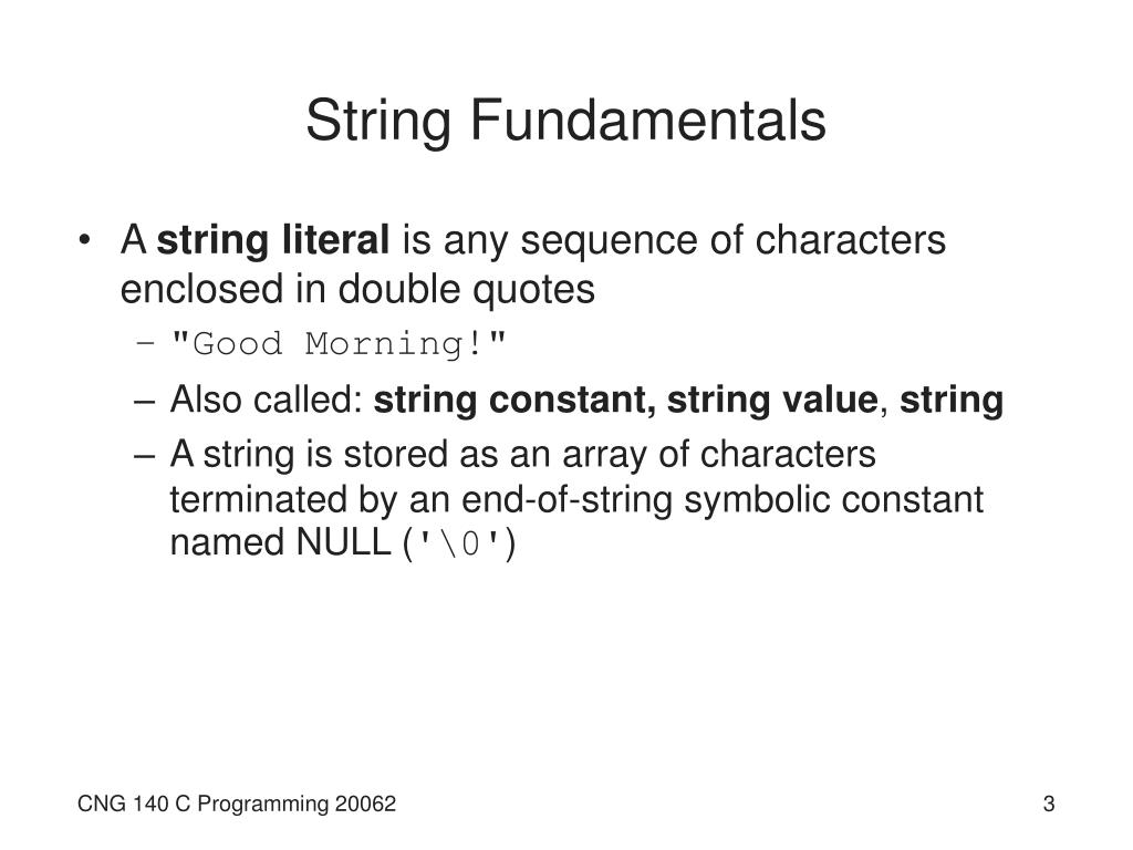 String Fundamentals • A string literal is any sequence of characters enclosed in double quotes • "Good Morning!" • Also called: string constant,string value, string • A string is stored as an array of characters terminated by an end-of-string symbolic constant named NULL ('\0') CNG 140 C Programming 20062