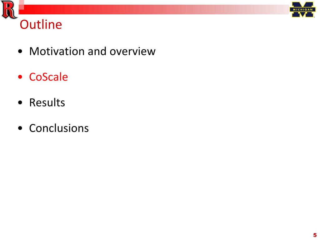 Need to conserve both CPU and memory energy Related work Lots of previous CPU DVFS works MemScale: Active low-power modes for memory [ASPLOS11] Uncoordinated DVFS causes poor behavior Conflicts, oscillations, unstable behavior May not generate the best energy savings Difficult to bound the performance degradation Need coordinated CPU and memory DVFS to achieve best results Challenge: Constrain the search space to good frequency combinations