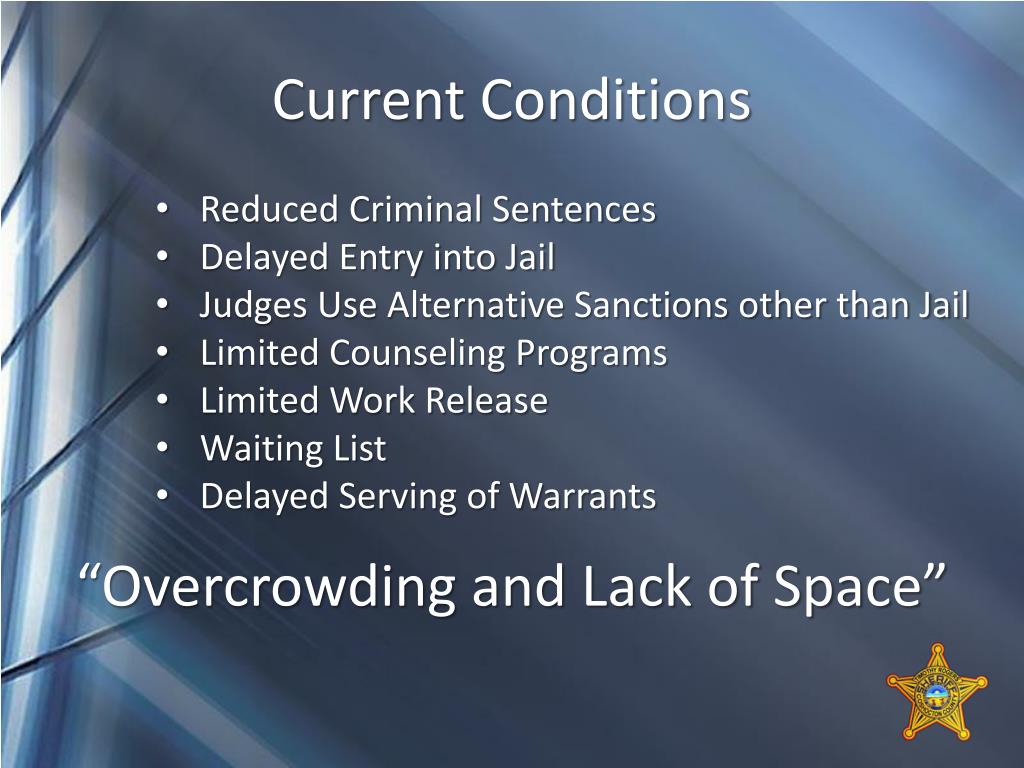 Current Conditions • Reduced Criminal Sentences • Delayed Entry into Jail • Judges Use Alternative Sanctions other than Jail • Limited Counseling Programs • Limited Work Release • Waiting List • Delayed Serving of Warrants “Overcrowding and Lack of Space”