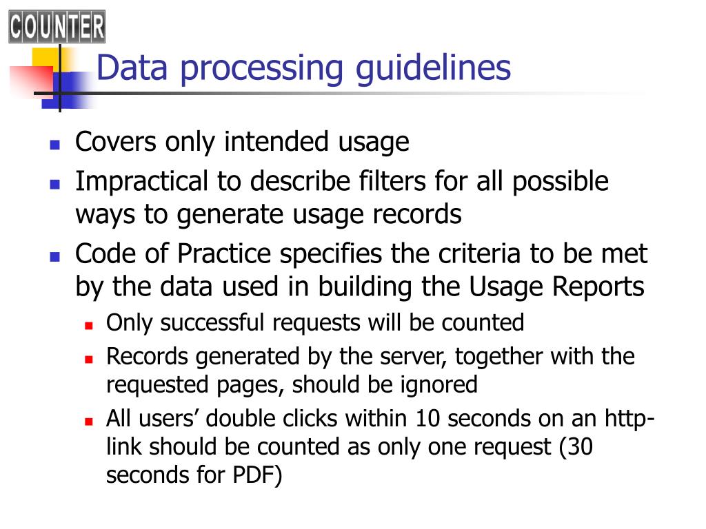 Data processing guidelines • Covers only intended usage • Impractical to describe filters for all possible ways to generate usage records • Code of Practice specifies the criteria to be met by the data used in building the Usage Reports • Only successful requests will be counted • Records generated by the server, together with the requested pages, should be ignored • All users’ double clicks within 10 seconds on an http-link should be counted as only one request (30 seconds for PDF)