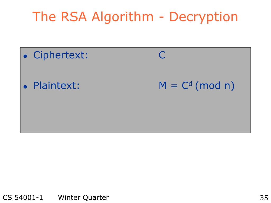 The RSA Algorithm - Encryption • Plaintext: M<n • Ciphertext: C = Me (mod n)