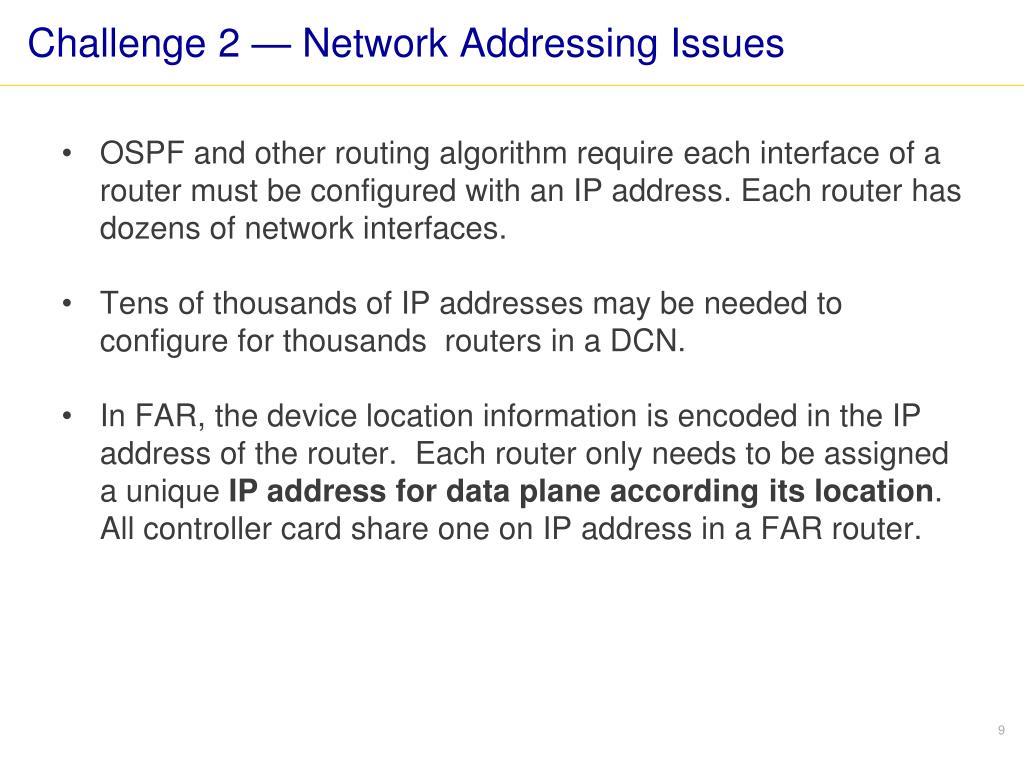 Challenge 2 — Network Addressing Issues • OSPF and other routing algorithm require each interface of a router must be configured with an IP address. Each router has dozens of network interfaces. • Tens of thousands of IP addresses may be needed to configure for thousands routers in a DCN. • In FAR, the device location information is encoded in the IP address of the router. Each router only needs to be assigned a unique IP address for data plane according its location. All controller card share one on IP address in a FAR router.