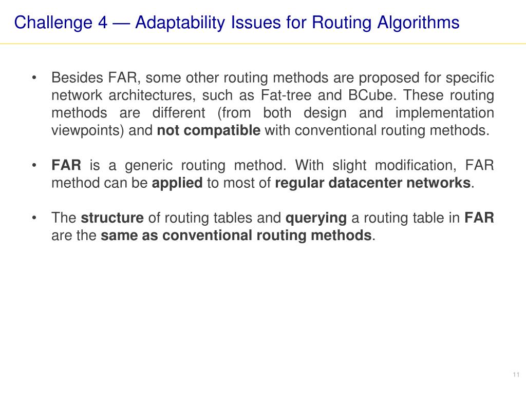 Challenge 4 — Adaptability Issues for Routing Algorithms • Besides FAR, some other routing methods are proposed for specific network architectures, such as Fat-tree and BCube. These routing methods are different (from both design and implementation viewpoints) and not compatible with conventional routing methods. • FAR is a generic routing method. With slight modification, FAR method can be applied to most of regular datacenter networks. • The structure of routing tables and querying a routing table in FAR are the same as conventional routing methods.