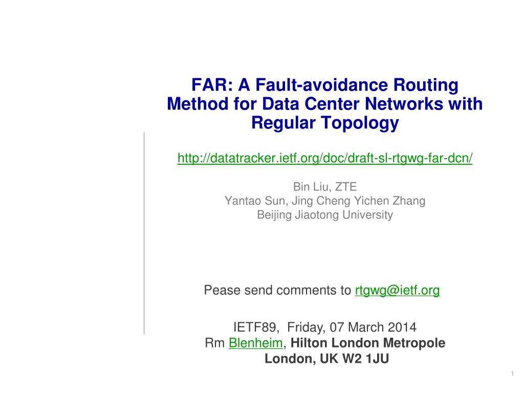 FAR: A Fault-avoidance Routing Method for Data Center Networks with Regular Topology http://datatracker.ietf.org/doc/draft-sl-rtgwg-far-dcn/ Bin Liu, ZTE Yantao Sun, Jing Cheng Yichen Zhang Beijing Jiaotong University Pease send comments to rtgwg@ietf.org IETF89, Friday, 07 March 2014 RmBlenheim, Hilton London Metropole London, UK W2 1JU