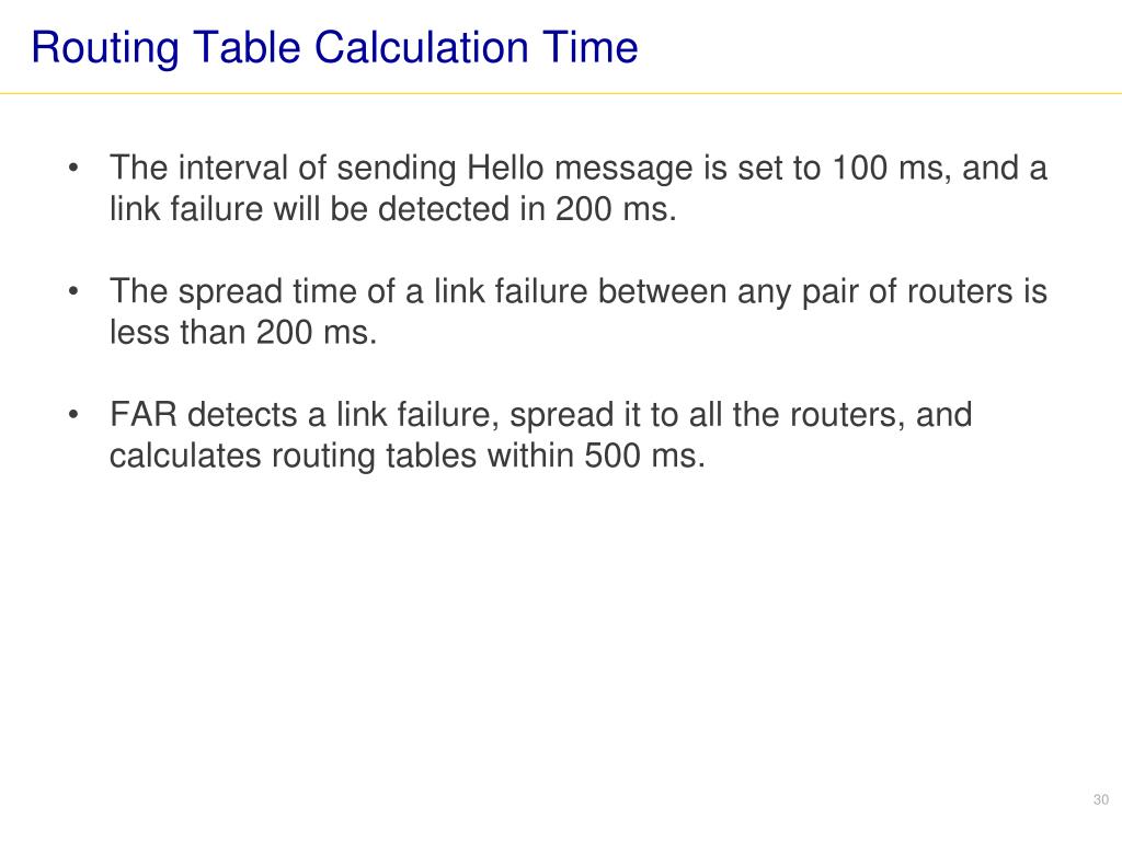 Routing Table Calculation Time • The interval of sending Hello message is set to 100 ms, and a link failure will be detected in 200 ms. • The spread time of a link failure between any pair of routers is less than 200 ms. • FAR detects a link failure, spread it to all the routers, and calculates routing tables within 500 ms.