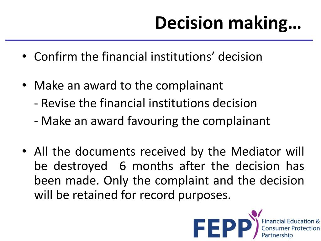 Decision making… • Confirm the financial institutions’ decision • Make an award to the complainant - Revise the financial institutions decision - Make an award favouring the complainant • All the documents received by the Mediator will be destroyed 6 months after the decision has been made. Only the complaint and the decision will be retained for record purposes.