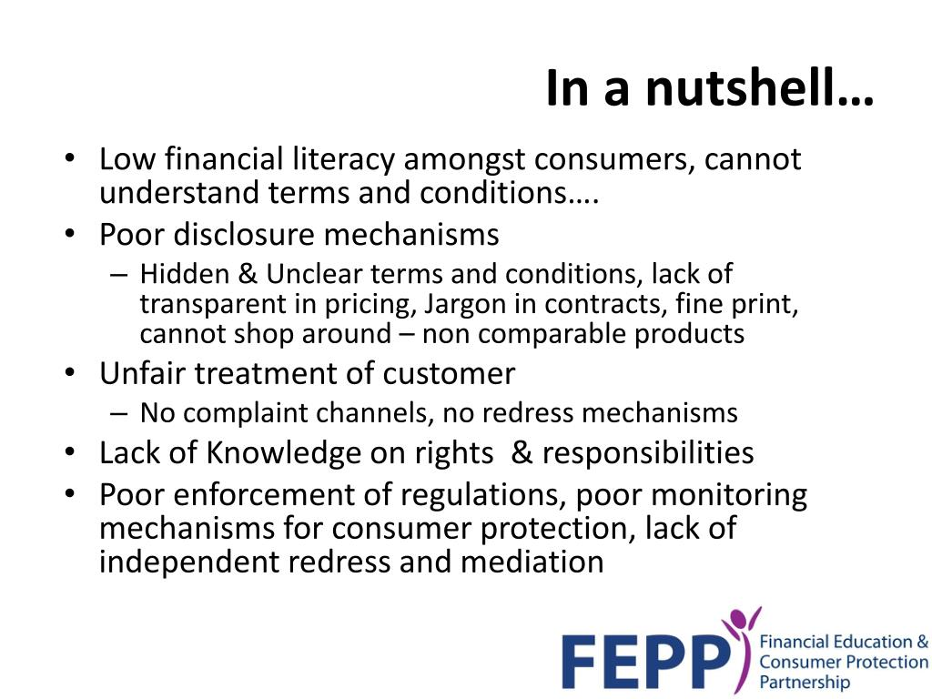 In a nutshell… • Low financial literacy amongst consumers, cannot understand terms and conditions…. • Poor disclosure mechanisms • Hidden & Unclear terms and conditions, lack of transparent in pricing, Jargon in contracts, fine print, cannot shop around – non comparable products • Unfair treatment of customer • No complaint channels, no redress mechanisms • Lack of Knowledge on rights & responsibilities • Poor enforcement of regulations, poor monitoring mechanisms for consumer protection, lack of independent redress and mediation
