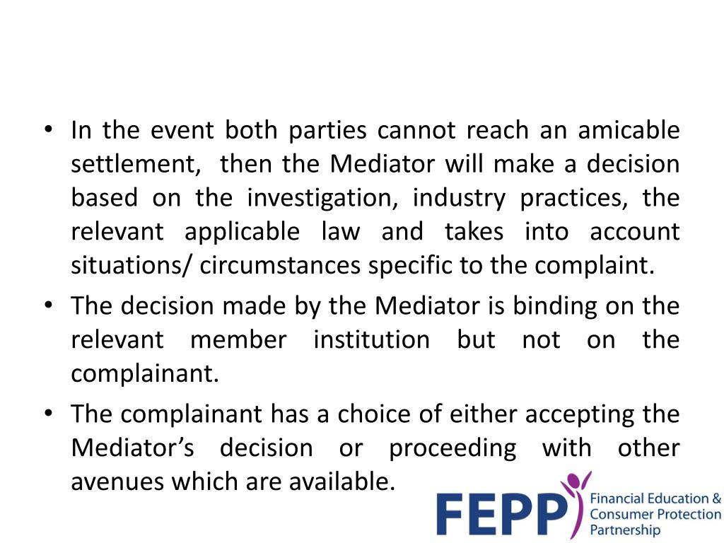 In the event both parties cannot reach an amicable settlement, then the Mediator will make a decision based on the investigation, industry practices, the relevant applicable law and takes into account situations/ circumstances specific to the complaint. • The decision made by the Mediator is binding on the relevant member institution but not on the complainant. • The complainant has a choice of either accepting the Mediator’s decision or proceeding with other avenues which are available.