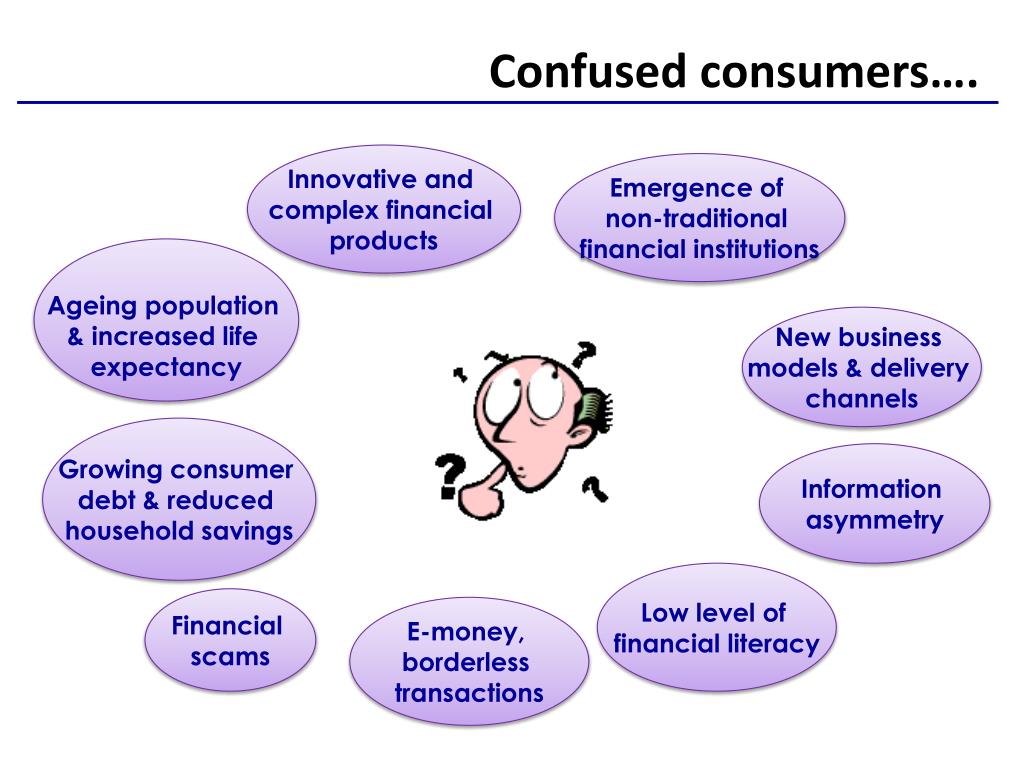 Confused consumers…. Innovative and complex financial products Emergence of non-traditional financial institutions Ageing population & increased life expectancy New business models & delivery channels Growing consumer debt & reduced household savings Information asymmetry Low level of financial literacy Financial scams E-money, borderless transactions