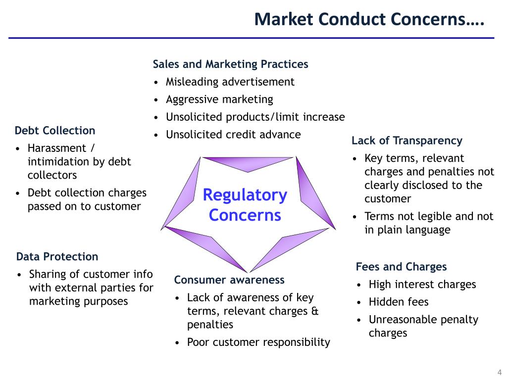 Market Conduct Concerns…. • Sales and Marketing Practices • Misleading advertisement • Aggressive marketing • Unsolicited products/limit increase • Unsolicited credit advance • Debt Collection • Harassment / intimidation by debt collectors • Debt collection charges passed on to customer • Lack of Transparency • Key terms, relevant charges and penalties not clearly disclosed to the customer • Terms not legible and not in plain language Regulatory Concerns • Data Protection • Sharing of customer info with external parties for marketing purposes • Fees and Charges • High interest charges • Hidden fees • Unreasonable penalty charges • Consumer awareness • Lack of awareness of key terms, relevant charges & penalties • Poor customer responsibility