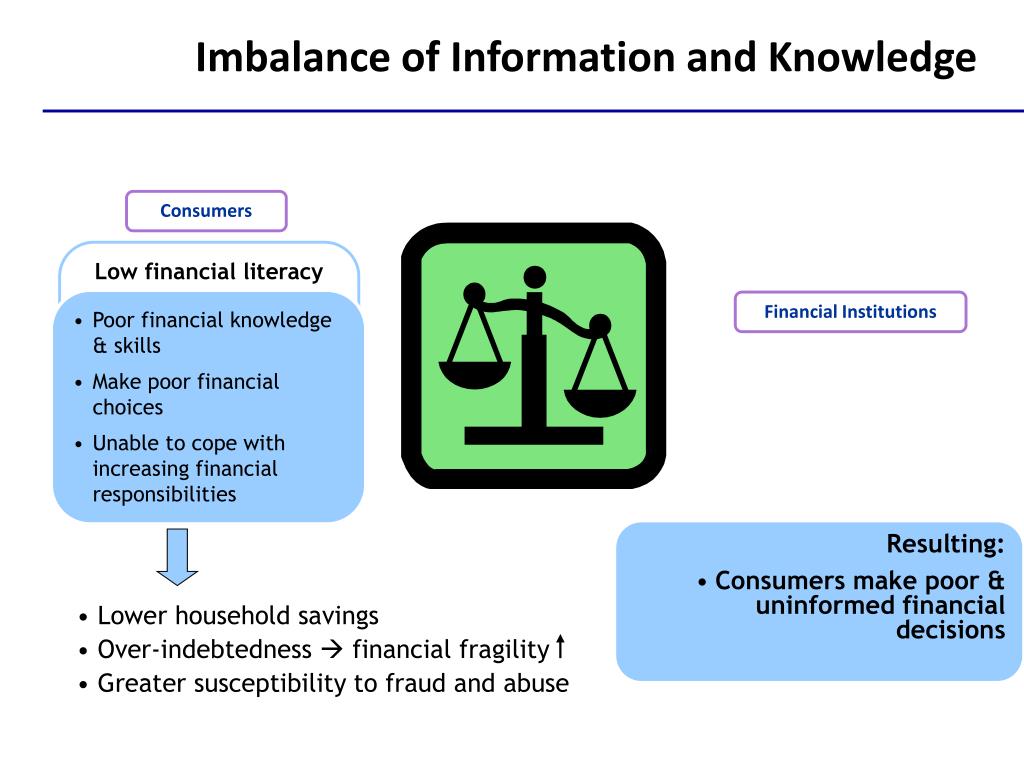Imbalance of Information and Knowledge Consumers Low financial literacy • Poor financial knowledge & skills • Make poor financial choices • Unable to cope with increasing financial responsibilities Financial Institutions • Resulting: • Consumers make poor & uninformed financial decisions • Lower household savings • Over-indebtedness financial fragility • Greater susceptibility to fraud and abuse
