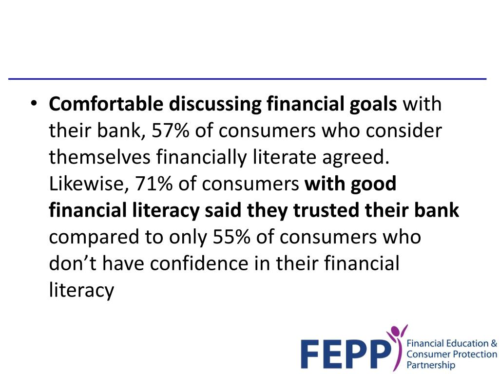 Comfortable discussing financial goals with their bank, 57% of consumers who consider themselves financially literate agreed. Likewise, 71% of consumers with good financial literacy said they trusted their bank compared to only 55% of consumers who don’t have confidence in their financial literacy