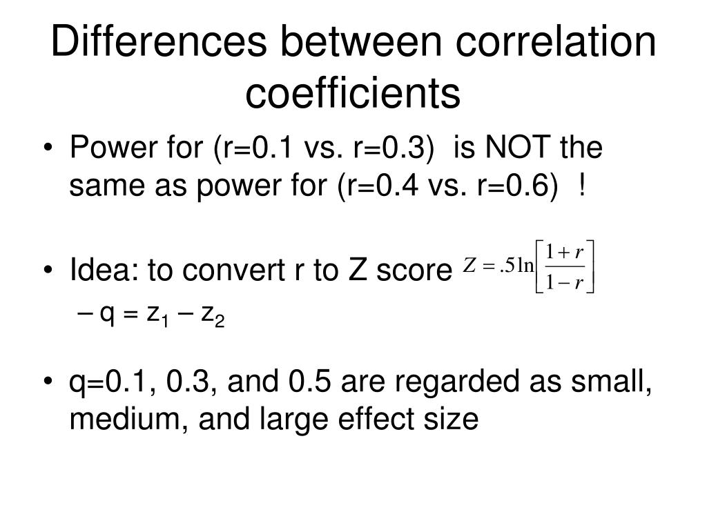 Differences between correlation coefficients • Power for (r=0.1 vs. r=0.3) is NOT the same as power for (r=0.4 vs. r=0.6) ! • Idea: to convert r to Z score • q = z1 – z2 • q=0.1, 0.3, and 0.5 are regarded as small, medium, and large effect size