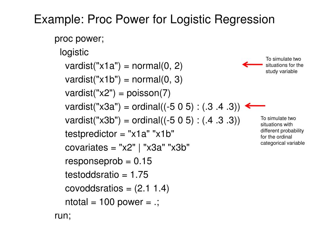 Example: Proc Power for Logistic Regression proc power; logistic vardist("x1a") = normal(0, 2) vardist("x1b") = normal(0, 3) vardist("x2") = poisson(7) vardist("x3a") = ordinal((-5 0 5) : (.3 .4 .3)) vardist("x3b") = ordinal((-5 0 5) : (.4 .3 .3)) testpredictor = "x1a" "x1b" covariates = "x2" | "x3a" "x3b" responseprob = 0.15 testoddsratio = 1.75 covoddsratios = (2.1 1.4) ntotal = 100 power = .; run; To simulate two situations for the study variable To simulate two situations with different probability for the ordinal categorical variable
