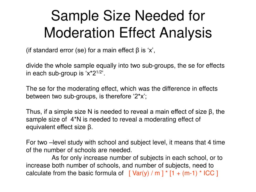 Sample Size Needed for Moderation Effect Analysis (if standard error (se) for a main effect β is ‘x’, divide the whole sample equally into two sub-groups, the se for effects in each sub-group is ‘x*21/2’. The se for the moderating effect, which was the difference in effects between two sub-groups, is therefore ‘2*x’; Thus, if a simple size N is needed to reveal a main effect of size β, the sample size of 4*N is needed to reveal a moderating effect of equivalent effect size β. For two –level study with school and subject level, it means that 4 time of the number of schools are needed. As for only increase number of subjects in each school, or to increase both number of schools, and number of subjects, need to calculate from the basic formula of [ Var(y) / m ] * [1 + (m-1) * ICC ]