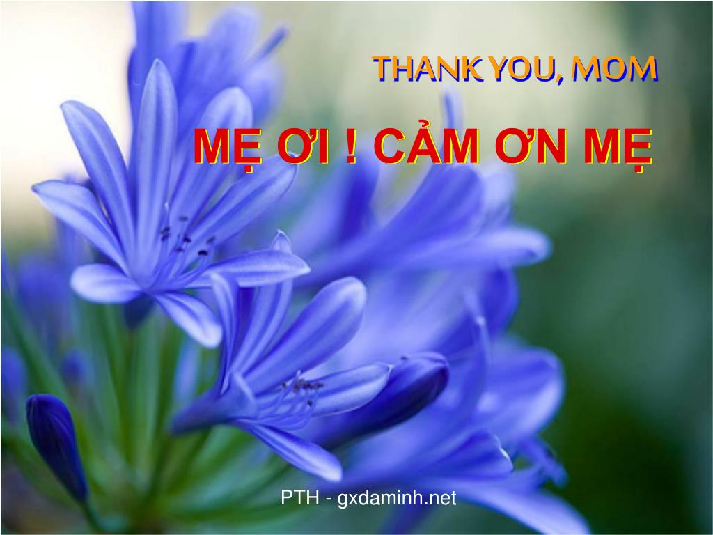 THANK YOU, MOM. MẸ ƠI ! CẢM ƠN MẸ. PTH - gxdaminh.net. Thank you for give me balance in my life. Cảm ơn mẹ đã cho con sự cân bằng trong cuộc sống. Thank you for teaching me a mother’s love is perennial. Cảm ơn mẹ đã dạy con tình thương mẫu tử là bất diệt.