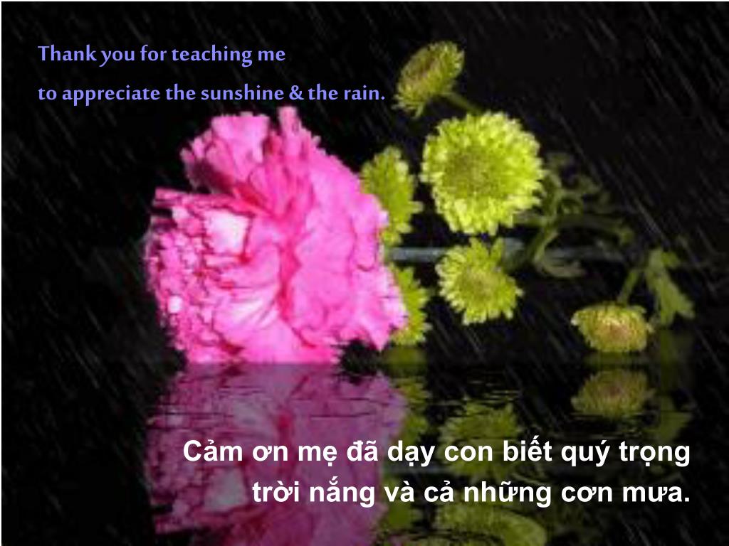 Thank you for teaching me to appreciate the sunshine & the rain. Cảm ơn mẹ đã dạy con biết quý trọng trời nắng và cả những cơn mưa.