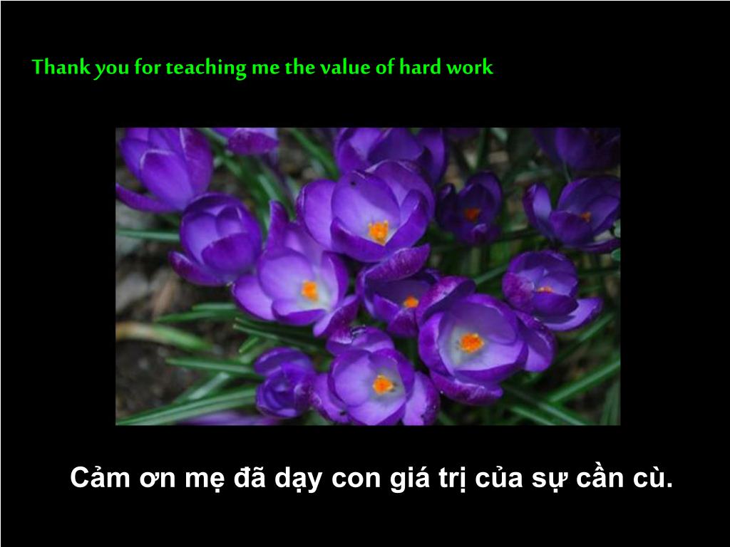 Thank you for teaching me the value of hard work Cảm ơn mẹ đã dạy con giá trị của sự cần cù.