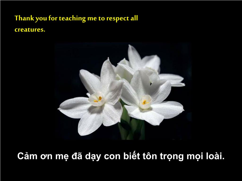 Thank you for teaching me to respect all creatures. Cảm ơn mẹ đã dạy con biết tôn trọng mọi loài.