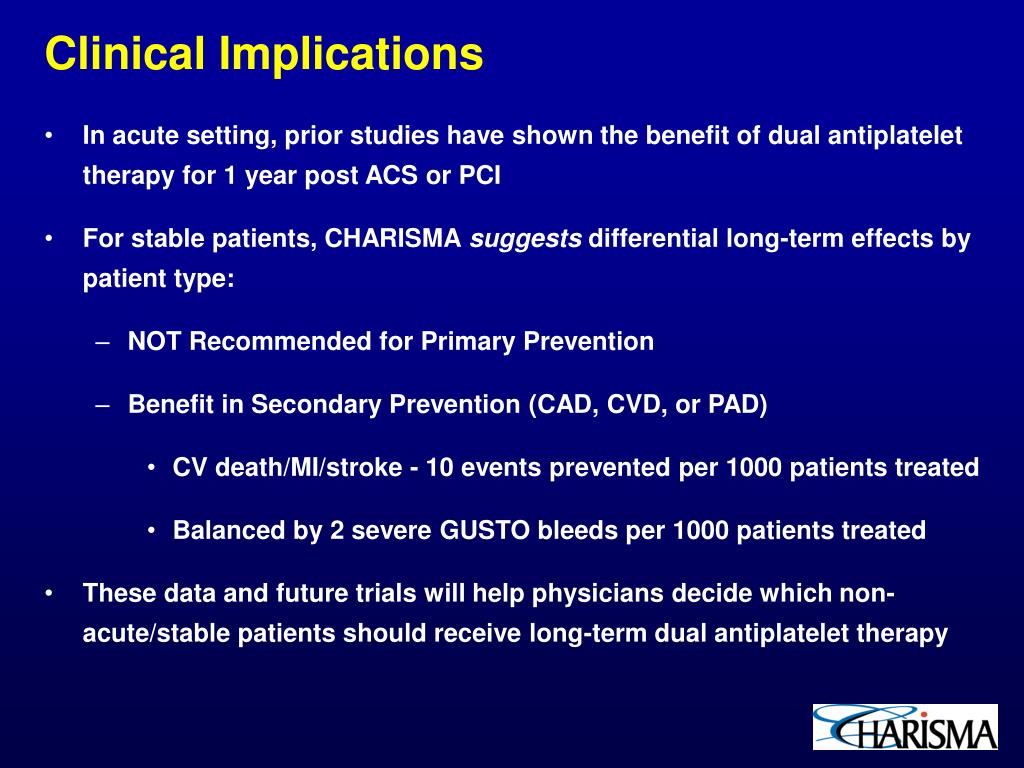 Clinical Implications • In acute setting, prior studies have shown the benefit of dual antiplatelet therapy for 1 year post ACS or PCI • For stable patients, CHARISMA suggests differential long-term effects by patient type: • NOT Recommended for Primary Prevention • Benefit in Secondary Prevention (CAD, CVD, or PAD) • CV death/MI/stroke - 10 events prevented per 1000 patients treated • Balanced by 2 severe GUSTO bleeds per 1000 patients treated • These data and future trials will help physicians decide which non-acute/stable patients should receive long-term dual antiplatelet therapy