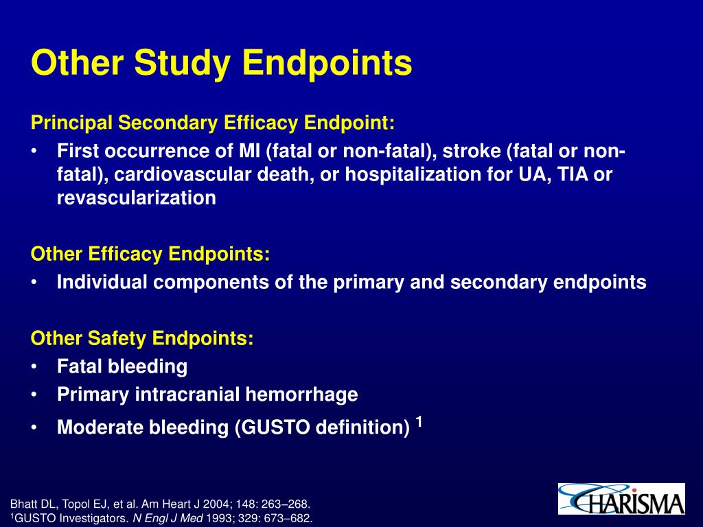Other Study Endpoints Principal Secondary Efficacy Endpoint: • First occurrence of MI (fatal or non-fatal), stroke (fatal or non-fatal), cardiovascular death, or hospitalization for UA, TIA or revascularization Other Efficacy Endpoints: • Individual components of the primary and secondary endpoints Other Safety Endpoints: • Fatal bleeding • Primary intracranial hemorrhage • Moderate bleeding (GUSTO definition) 1 Bhatt DL, Topol EJ, et al. Am Heart J 2004; 148: 263–268. 1GUSTO Investigators. N Engl J Med 1993; 329: 673–682.
