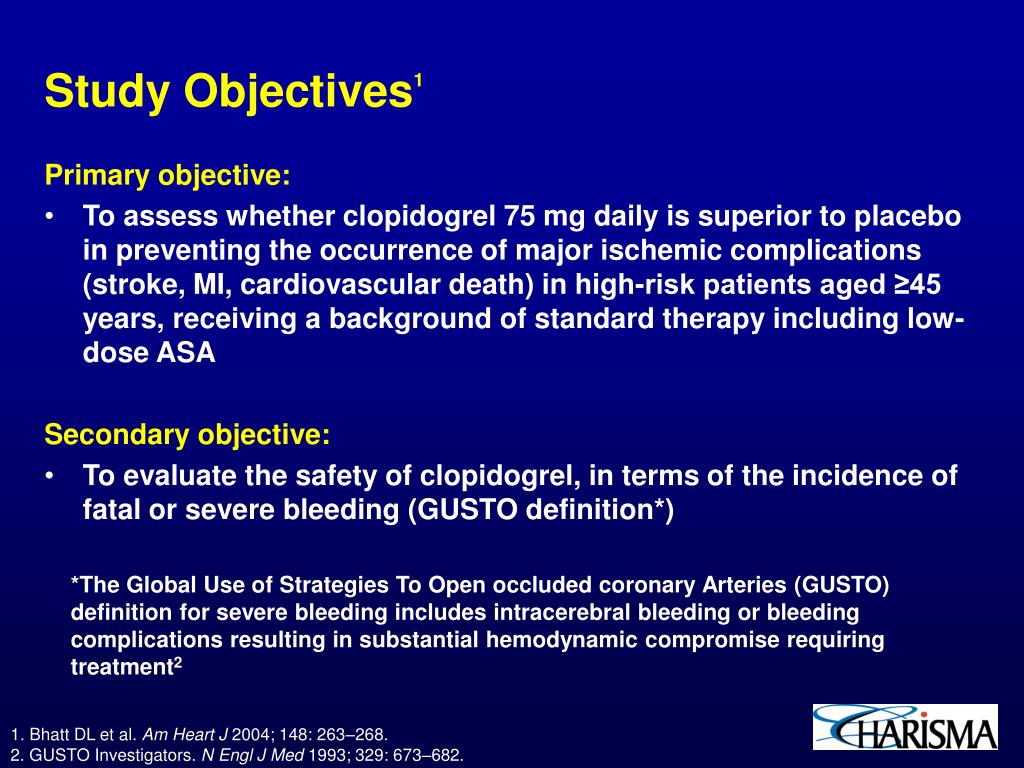 Study Objectives1 Primary objective: • To assess whether clopidogrel 75 mg daily is superior to placebo in preventing the occurrence of major ischemic complications (stroke, MI, cardiovascular death) in high-risk patients aged ≥45 years, receiving a background of standard therapy including low-dose ASA Secondary objective: • To evaluate the safety of clopidogrel, in terms of the incidence of fatal or severe bleeding (GUSTO definition*) *The Global Use of Strategies To Open occluded coronary Arteries (GUSTO) definition for severe bleeding includes intracerebral bleeding or bleeding complications resulting in substantial hemodynamic compromise requiring treatment2 1. Bhatt DL et al. Am Heart J 2004; 148: 263–268. 2. GUSTO Investigators. N Engl J Med 1993; 329: 673–682.