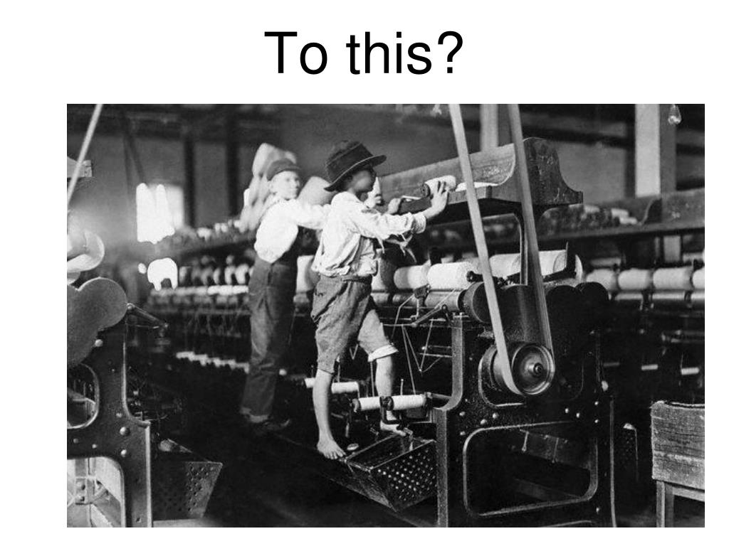 Working Conditions and Wages • Common working day: 12 – 14 hours • One short break for lunch • Work week: 6 days per week • 80 degree heat • Workers were beaten if they did not perform well. • Hot, polluted factory air. • Workers risked losing limbs from the machines. • Low wages.