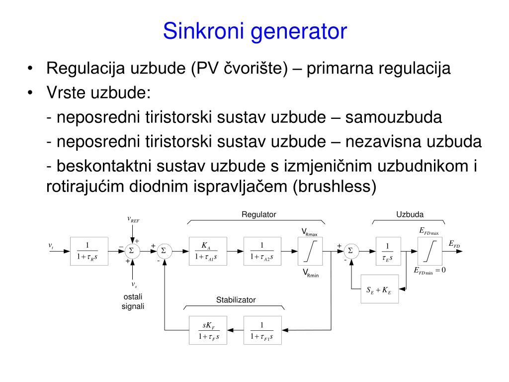 Sinkroni generator • Regulacija uzbude (PV čvorište) – primarna regulacija • Vrste uzbude: - neposredni tiristorski sustav uzbude – samouzbuda - neposredni tiristorski sustav uzbude – nezavisna uzbuda - beskontaktni sustav uzbude s izmjeničnim uzbudnikom i rotirajućim diodnim ispravljačem (brushless)