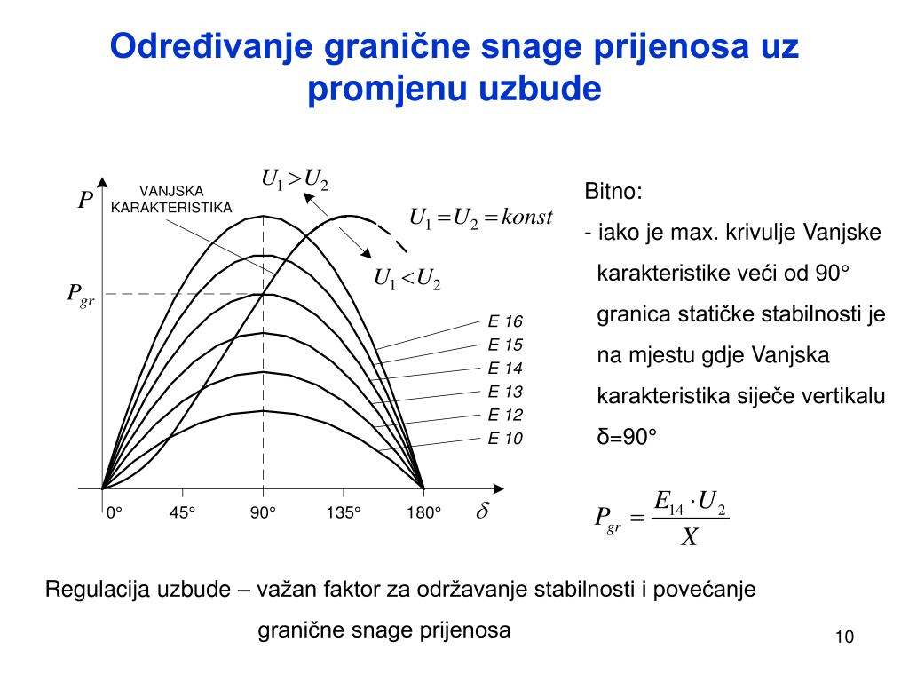 Određivanje granične snage prijenosa uz promjenu uzbude • Bitno: • iako je max. krivulje Vanjske • karakteristike veći od 90° • granica statičke stabilnosti je • na mjestu gdje Vanjska • karakteristika siječe vertikalu • δ=90° Regulacija uzbude – važan faktor za održavanje stabilnosti i povećanje granične snage prijenosa