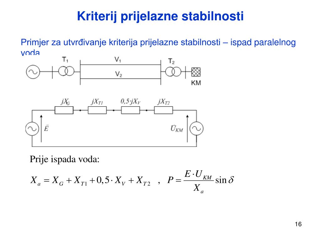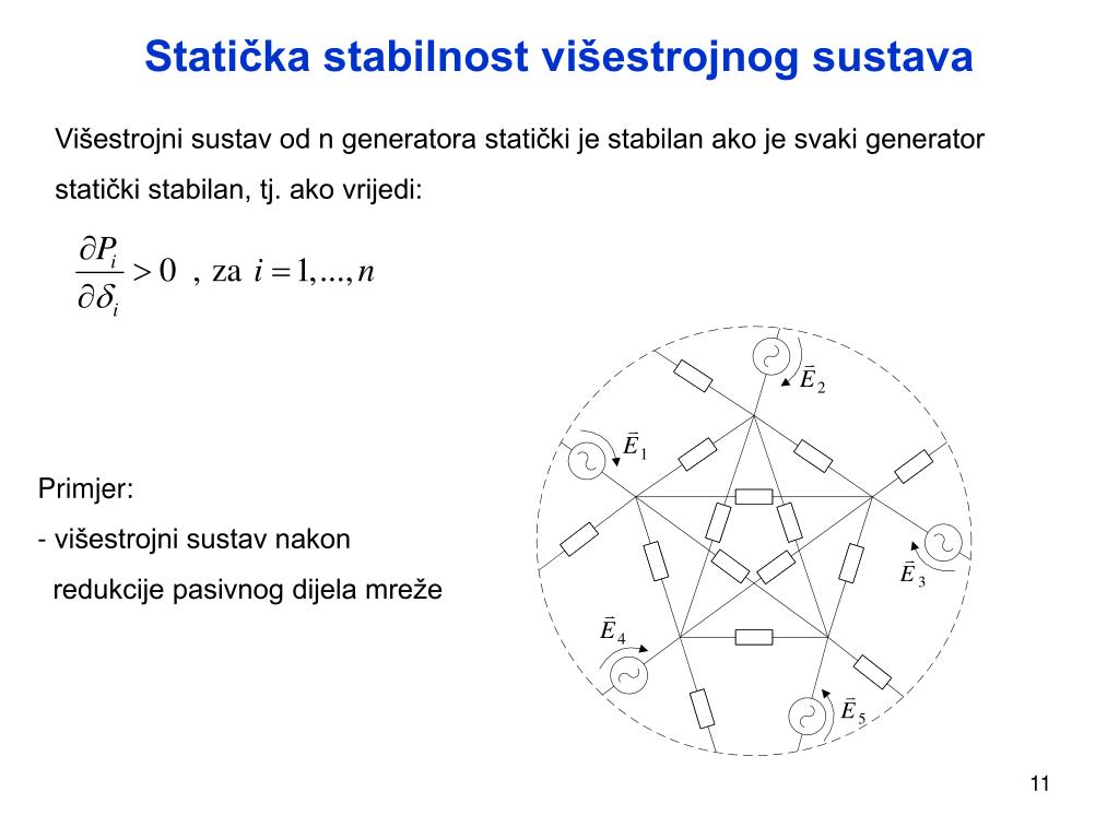 Statička stabilnost višestrojnog sustava Višestrojni sustav od n generatora statički je stabilan ako je svaki generator statički stabilan, tj. ako vrijedi: • Primjer: • višestrojni sustav nakon • redukcije pasivnog dijela mreže