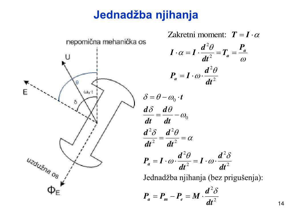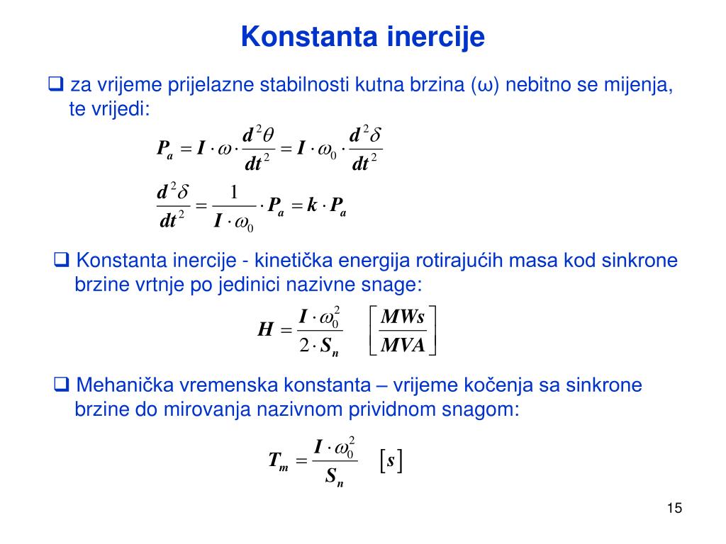 Konstanta inercije • za vrijeme prijelazne stabilnosti kutna brzina (ω) nebitno se mijenja, • te vrijedi: • Konstanta inercije - kinetička energija rotirajućih masa kod sinkrone • brzine vrtnje po jedinici nazivne snage: • Mehanička vremenska konstanta – vrijeme kočenja sa sinkrone • brzine do mirovanja nazivnom prividnom snagom: