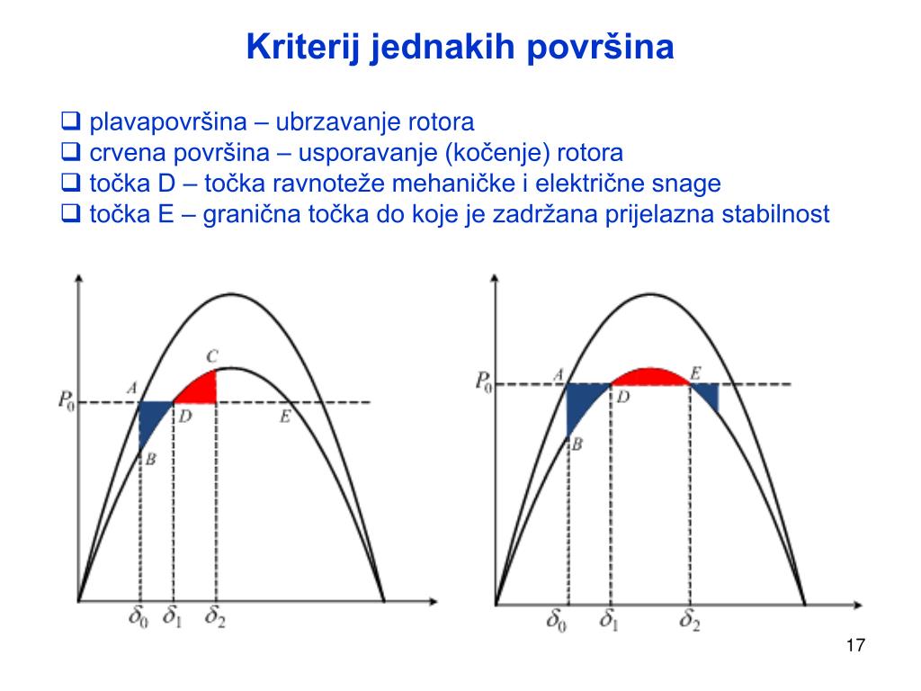 Kriterij jednakih površina • plavapovršina – ubrzavanje rotora • crvena površina – usporavanje (kočenje) rotora • točka D – točka ravnoteže mehaničke i električne snage • točka E – granična točka do koje je zadržana prijelazna stabilnost