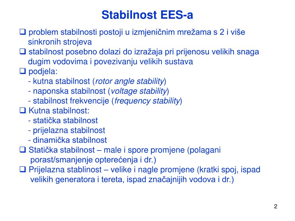 Stabilnost EES-a • problem stabilnosti postoji u izmjeničnim mrežama s 2 i više • sinkronih strojeva • stabilnost posebno dolazi do izražaja pri prijenosu velikih snaga • dugim vodovima i povezivanju velikih sustava • podjela: • - kutna stabilnost (rotor angle stability) • - naponska stabilnost (voltage stability) • - stabilnost frekvencije (frequency stability) • Kutna stabilnost: • - statička stabilnost • - prijelazna stabilnost • - dinamička stabilnost • Statička stabilnost – male i spore promjene (polagani • porast/smanjenje opterećenja i dr.) • Prijelazna stablinost – velike i nagle promjene (kratki spoj, ispad • velikih generatora i tereta, ispad značajnijih vodova i dr.)