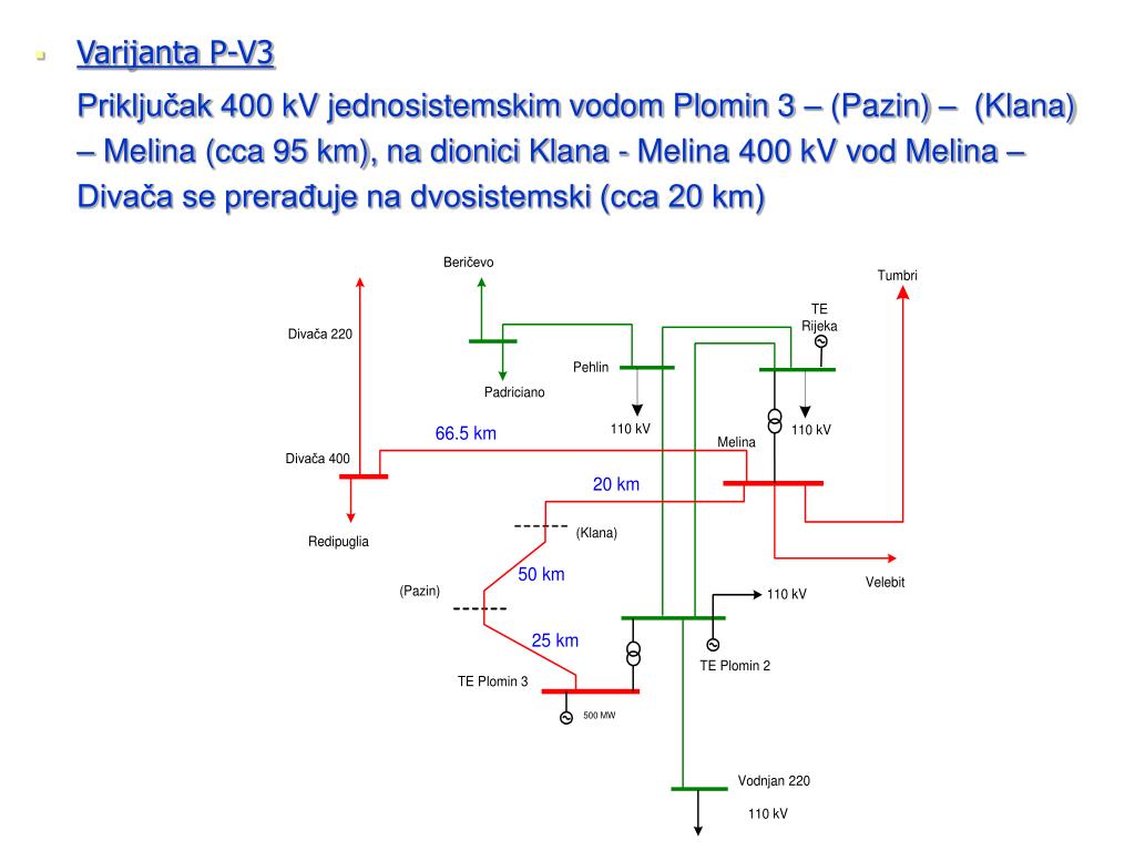 Polazna rješenja priključka TE Plomin C-500 na EES • Varijanta P-V1 Priključak 400 kV dvosistemskim vodom Plomin 3 – (Pazin) – RS Klana (cca 75 km), 400 kV vod Melina – Divača se dijeli na dva dijela: Melina – RS Klana (cca 20 km) i RS Klana – Divača (cca 46.5 km)
