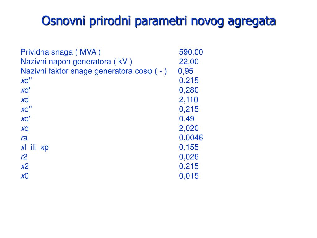 Osnovni prirodni parametri novog agregata Prividna snaga ( MVA ) 590,00 Nazivni napon generatora ( kV ) 22,00 Nazivni faktor snage generatora cosφ ( - ) 0,95 xd'' 0,215 xd' 0,280 xd 2,110 xq'' 0,215 xq' 0,49 xq 2,020 ra 0,0046 xl ili xp 0,155 r2 0,026 x2 0,215 x0 0,015