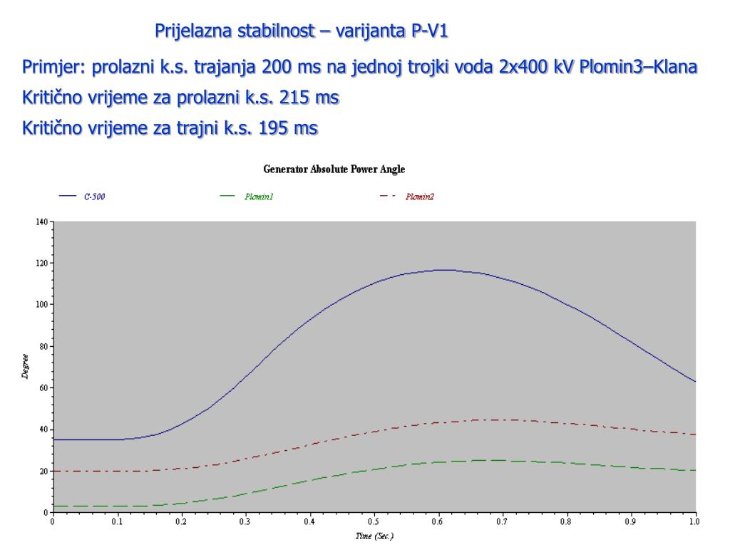 Prijelazna stabilnost – varijanta P-V1 Primjer: prolazni k.s. trajanja 200 ms na jednoj trojki voda 2x400 kV Plomin3–Klana Kritično vrijeme za prolazni k.s. 215 ms Kritično vrijeme za trajni k.s. 195 ms