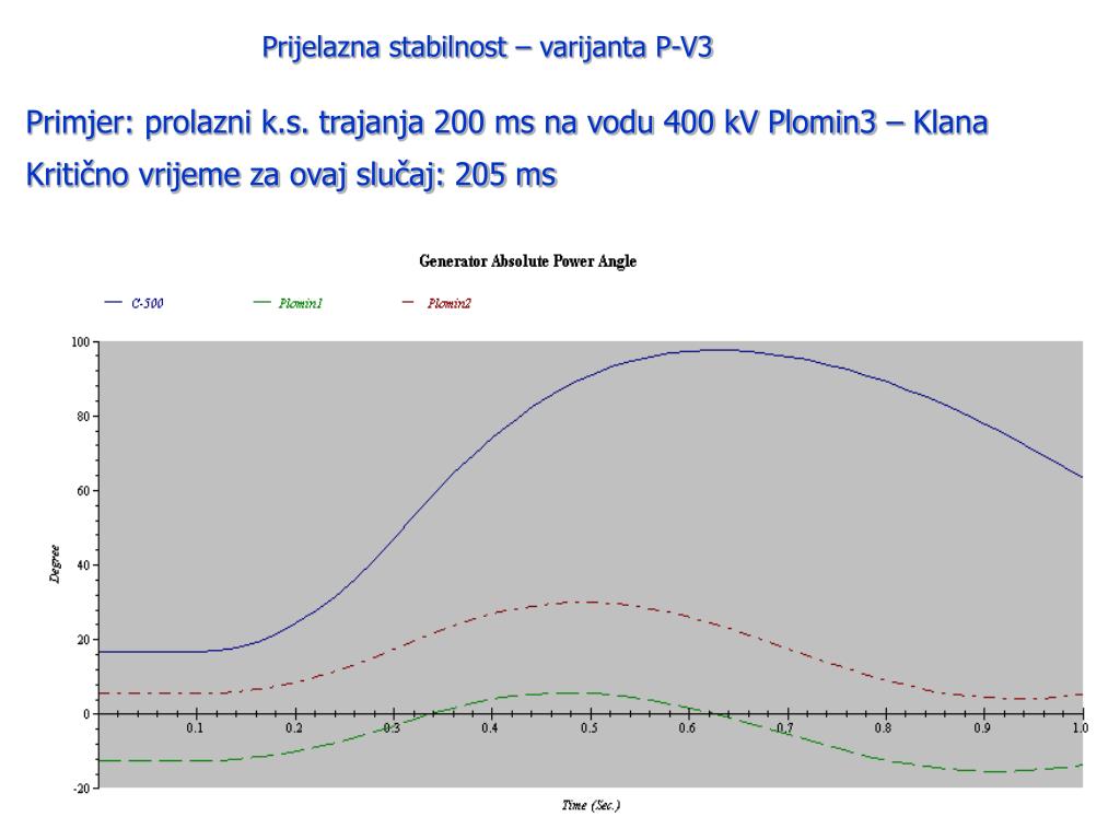 Prijelazna stabilnost – varijanta P-V3 Primjer: prolazni k.s. trajanja 200 ms na vodu 400 kV Plomin3 – Klana Kritično vrijeme za ovaj slučaj: 205 ms