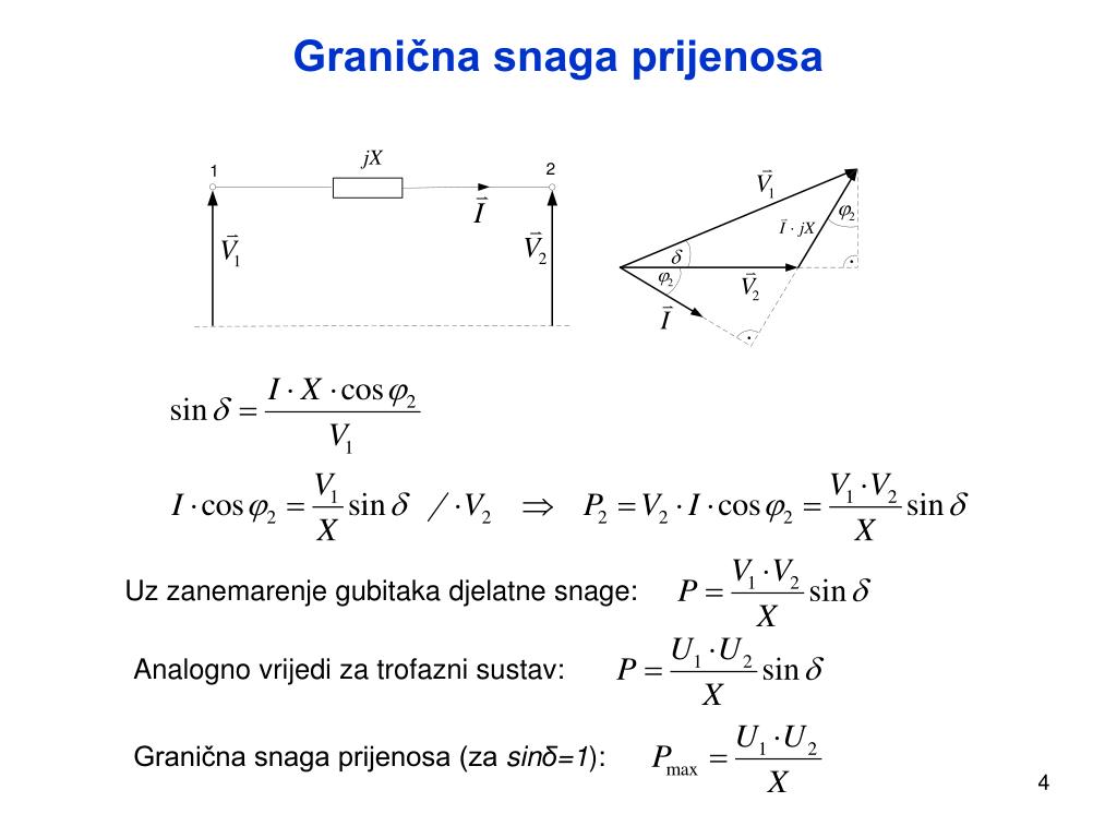 Granična snaga prijenosa Uz zanemarenje gubitaka djelatne snage: Analogno vrijedi za trofazni sustav: Granična snaga prijenosa (za sinδ=1):