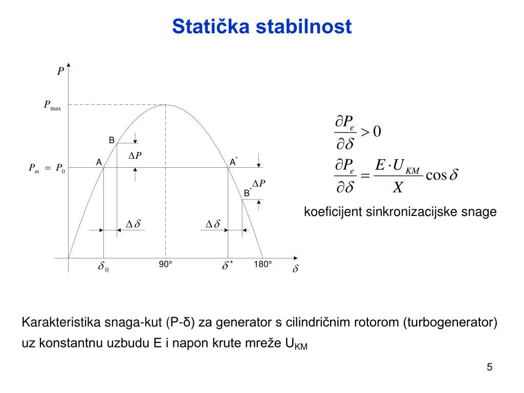 Statička stabilnost koeficijent sinkronizacijske snage Karakteristika snaga-kut (P-δ) za generator s cilindričnim rotorom (turbogenerator) uz konstantnu uzbudu E i napon krute mreže UKM