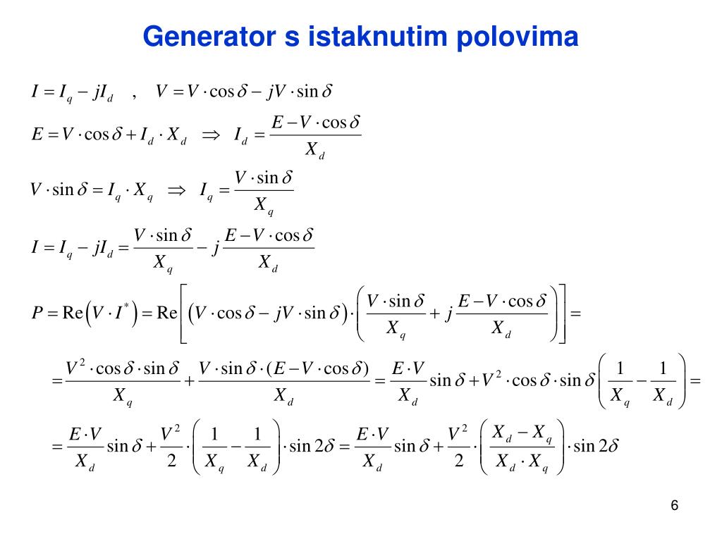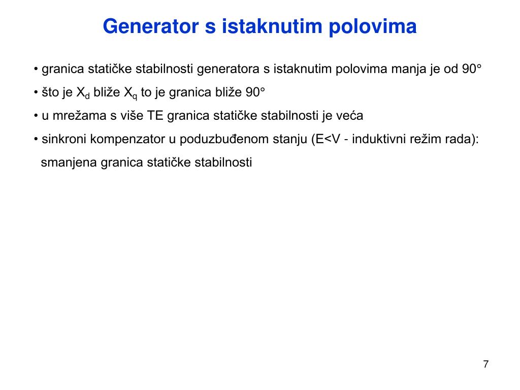Generator s istaknutim polovima • granica statičke stabilnosti generatora s istaknutim polovima manja je od 90° • što je Xd bliže Xq to je granica bliže 90° • u mrežama s više TE granica statičke stabilnosti je veća • sinkroni kompenzator u poduzbuđenom stanju (E<V - induktivni režim rada): • smanjena granica statičke stabilnosti