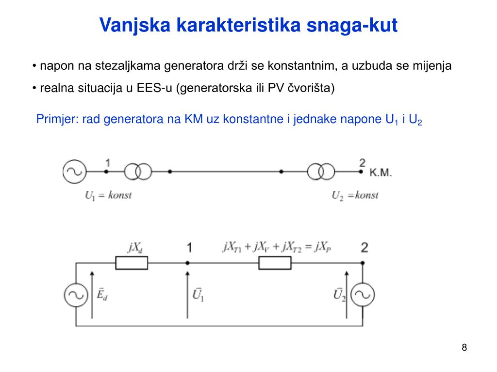 Vanjska karakteristika snaga-kut • napon na stezaljkama generatora drži se konstantnim, a uzbuda se mijenja • realna situacija u EES-u (generatorska ili PV čvorišta) Primjer: rad generatora na KM uz konstantne i jednake napone U1 i U2