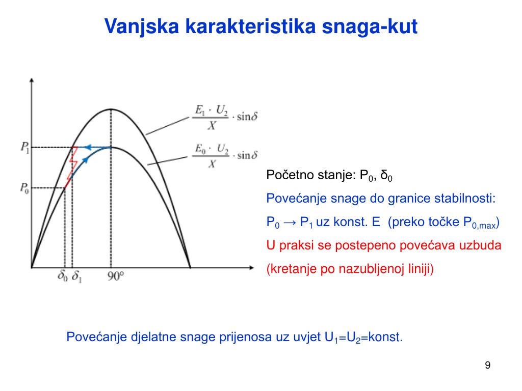 Vanjska karakteristika snaga-kut Početno stanje: P0, δ0 Povećanje snage do granice stabilnosti: P0 → P1 uz konst. E (preko točke P0,max) U praksi se postepeno povećava uzbuda (kretanje po nazubljenoj liniji) Povećanje djelatne snage prijenosa uz uvjet U1=U2=konst.