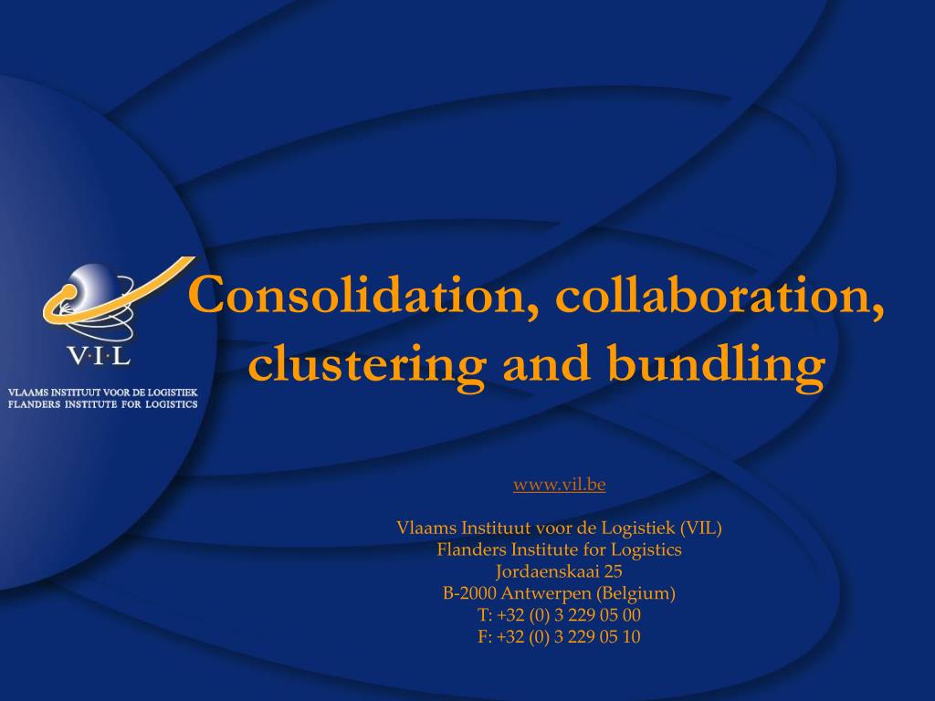Consolidation, collaboration, clustering and bundling www.vil.be Vlaams Instituut voor de Logistiek (VIL) Flanders Institute for Logistics Jordaenskaai 25 B-2000 Antwerpen (Belgium) T: +32 (0) 3 229 05 00 F: +32 (0) 3 229 05 10