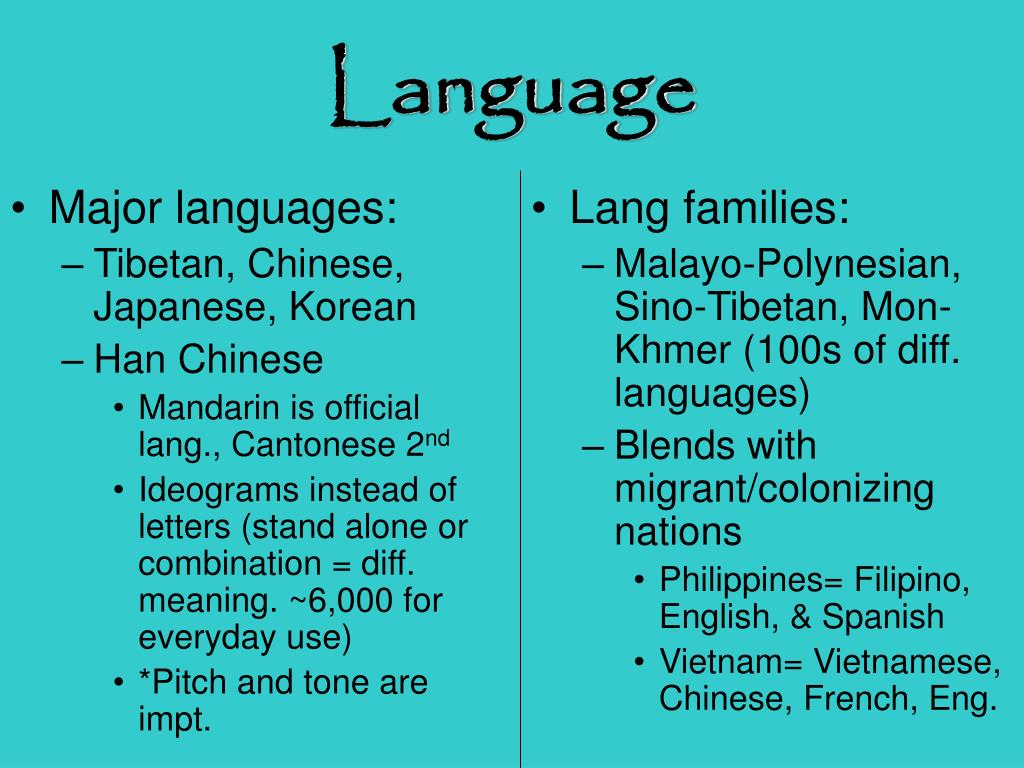 Major languages: Tibetan, Chinese, Japanese, Korean Han Chinese Mandarin is official lang., Cantonese 2nd Ideograms instead of letters (stand alone or combination = diff. meaning. ~6,000 for everyday use) *Pitch and tone are impt. Lang families: Malayo-Polynesian, Sino-Tibetan, Mon-Khmer (100s of diff. languages) Blends with migrant/colonizing nations Philippines= Filipino, English, & Spanish Vietnam= Vietnamese, Chinese, French, Eng. Language